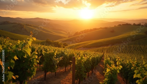 Naklejka premium Golden hour over picturesque vineyard. Rolling hills landscape, sun sets over...