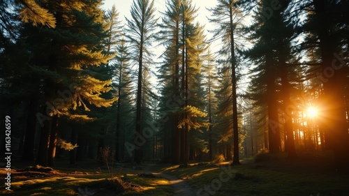 © Vibrant Visions Pixe, Fototapeta premium Golden Hour Pathway Through a Majestic Pine Forest