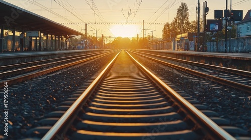 Fototapeta premium Golden Hour Railway: A Scenic Sunset at the Train Station