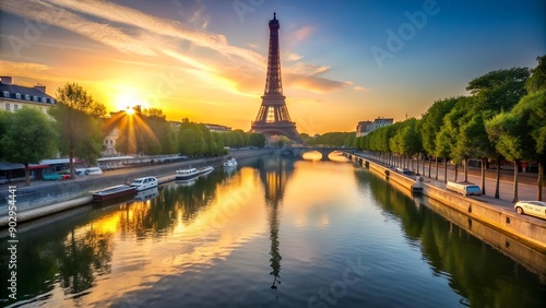 Obraz premium Golden Hour Reflections: A Parisian Silhouette AI Generated