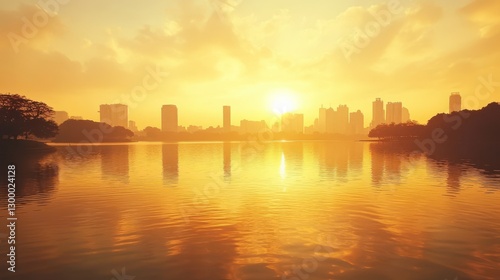 © MyStockz, Fototapeta premium Golden Hour Reflections Over Urban Lakes
