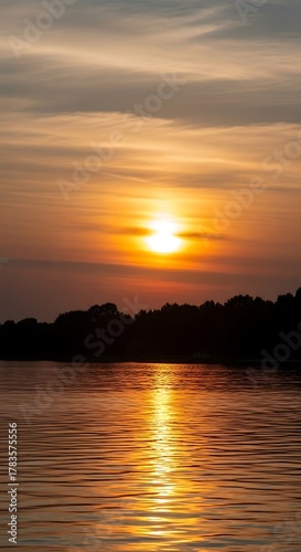 © Wati, Naklejka premium Golden Hour Reflections - Serene Sunset Over Still Waters.