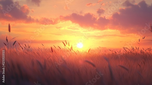 © iam, Obraz premium Golden Hour Serenity: Sunset over a Wheat Field