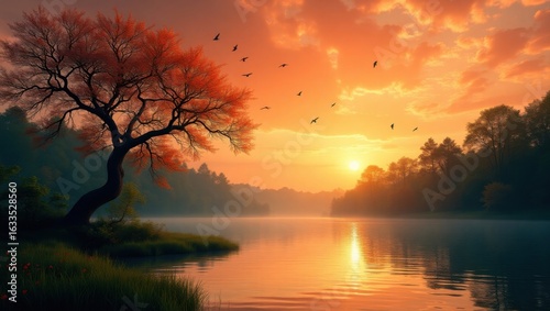© Masud, Fototapeta premium Golden Hour Serenity Tree Reflects in Tranquil Water Under a Sky Filled with Flying Birds