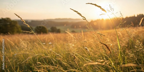 Obraz premium Golden Hour Sun Rays Glowing Through Tall Grass Blades in a Field of Lush...