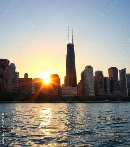 Obraz premium Golden hour sun sets over Chicago's skyscrapers reflected in Lake Michigan's calm waters, buildings, lake Michigan, top