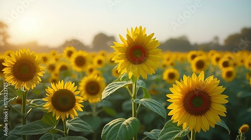 © Stock Photo Zone, Fototapeta premium Golden Hour Sunflowers: A Field of Radiant Yellow Blooms at Sunrise, Close-Up View