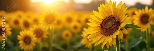 Fototapeta premium Golden hour sunlight bathes a lush field of ripening sunflowers, buzzing with bees; a quintessential summer harvest scene , summer harvest, bees