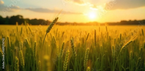 Obraz premium Golden hour sunlight bathes a lush field of ripening wheat, swaying gently in...