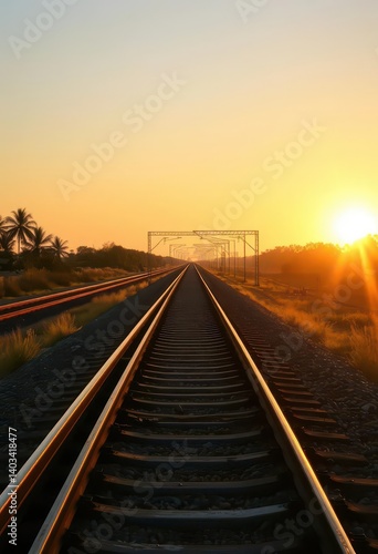 Fototapeta premium Golden hour sunlight bathes empty railway tracks stretching to the horizon, distant, landscape
