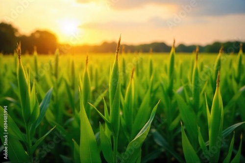 © Poom, Fototapeta premium Golden hour sunlight bathes lush green corn stalks, heavy with ripening ears, in a vast summer field A vibrant scene of abundant summertime agriculture , sun, harvest time