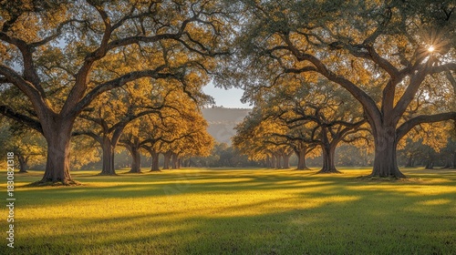 © Umi, Fototapeta premium Golden hour sunlight illuminates a grassy field lined with majestic oak trees.