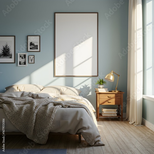© Phsycopeth, Obraz premium Golden Hour Sunlight Illuminates a Tranquil Bedroom with a Blank Wall Art Mockup.