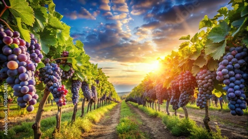© VisualVault, Naklejka premium Golden hour sunlight illuminates rows of ripe red grapes hanging heavy on vines in a vineyard