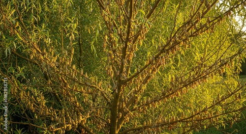 © budi, Fototapeta premium Golden Hour Sunlight Illuminates Willow Tree with Numerous Insect Cocoons