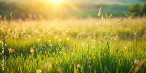 Fototapeta premium Golden hour sunlight illuminating a vibrant green meadow, showcasing tall...