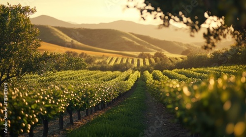 © uswatun, Fototapeta premium Golden Hour Sunlight on Lush Vineyard Rows with Distant Mountain Range