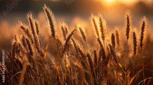 Fototapeta premium Golden hour sunlight shines through wheat field creating a warm, inviting,...