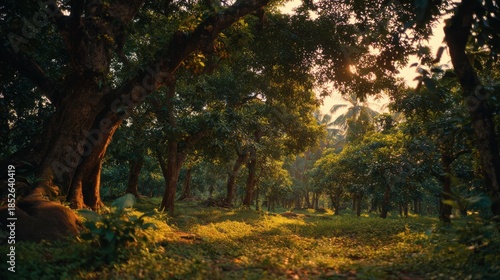 Naklejka premium Golden hour sunlight warmly illuminates a lime plantation with mature trees and a verdant undergrowth, creating a peaceful and inviting atmosphere at sunset.