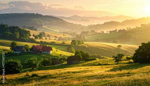 © rizki, Naklejka premium Golden Hour Sunrise Over Rolling Hills With Distant Village And Mist In The Valley