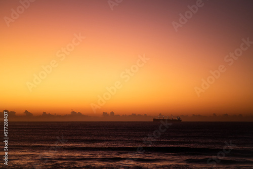 © Ryan, Fototapeta premium golden hour sunrise over the ocean with a ship silhouette