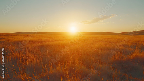 © Swaha, Obraz premium Golden hour sunset over a vast, undulating field of tall grass, bathed in warm, golden light. The sun sets on the horizon creating a stunning landscape.