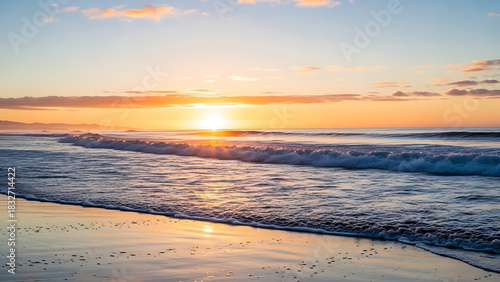 © mdfahimahmed, Fototapeta premium Golden hour sunset over ocean waves washing onto a sandy beach shore