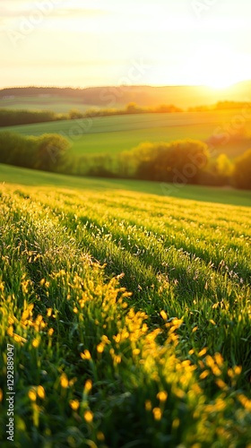 © Bakso, Obraz premium Golden Hour Sunset Over Rolling Green Hills and Wheat Field