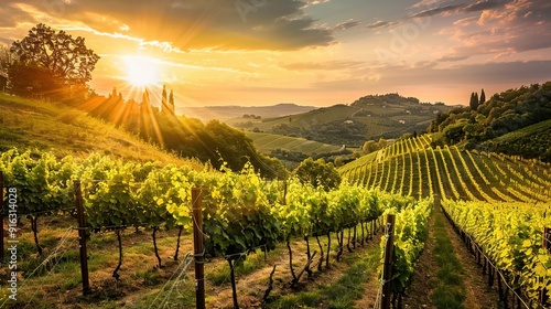 Fototapeta premium Golden Hour Sunset Over Rolling Hills of a Vineyard