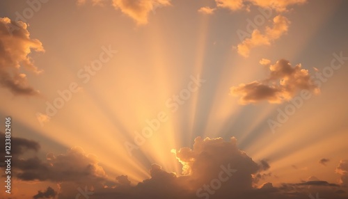 Fototapeta premium Golden Hour Sunset: Radiant Sunbeams Pierce Cloudscape