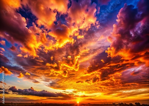 © Man888, Naklejka premium Golden Hour Sunset Sky: Vibrant Cloudscape with Bokeh Effect