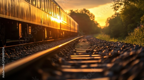 © Alfan Mask, Obraz premium Golden hour train journey with sunlit tracks and serene landscape view