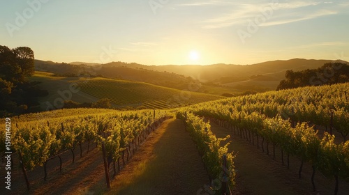 © Zie, Naklejka premium Golden Hour Vineyard Landscape: Rolling Hills, Sunset Serenity