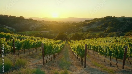 Fototapeta premium Golden Hour Vineyard Rows at Sunset Rural Landscape