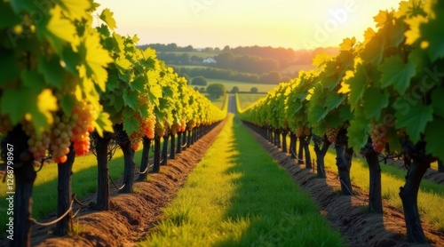 © Mali, Fototapeta premium Golden Hour Vineyard Rows Sunlit Grapes Hanging Heavy on Vines, Lush Green Grass Between Rows Leading to a Distant Horizon