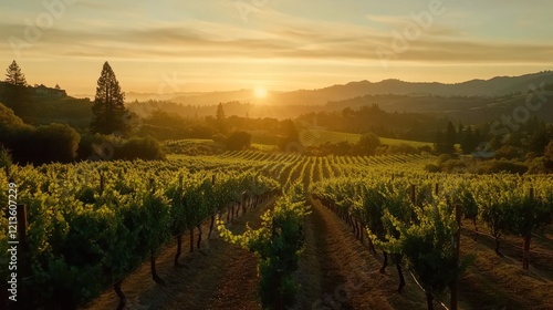© isrofiyah, Naklejka premium Golden Hour Vineyard: Serene Sunset over Rolling Hills