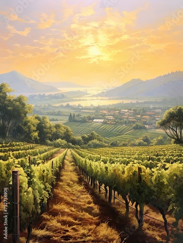 Naklejka premium Golden Hour Vineyards Morning Mist Painting: Captivating Vineyard Scene in...