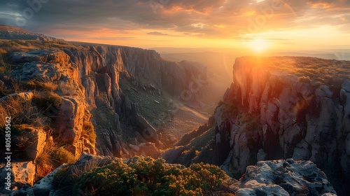 Fototapeta premium Golden hour, warm spring, deep inlets surrounded by steep, narrow cliffs.