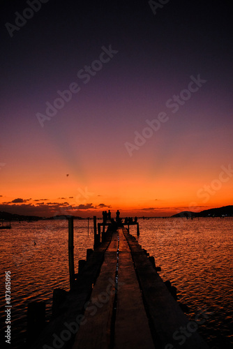 © grit.wattanapruek, Fototapeta premium Golden hues of sunset paint the sky and reflect on the tranquil waters, creating a serene and picturesque scene by the pier
