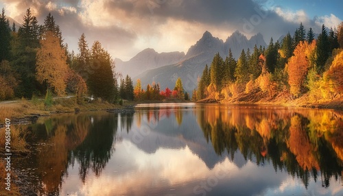 © Baloch, Naklejka premium "Golden Hues: Sunlit Tranquility in Nature's Canvas"water, lake, autumn, landscape, nature, river, reflection,