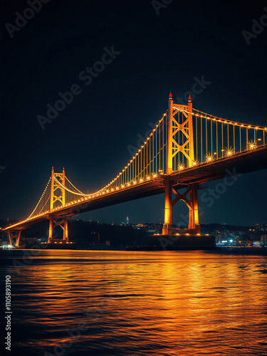 Obraz premium Golden Istanbul Bosphorus Bridge at Night with Long Exposure, turkish architecture, city lights, long exposure photography, istanbul turkey