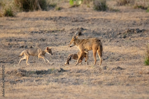Obraz premium Golden jackal, Canis aureus mother with pups, Kanha National Park Madhya...