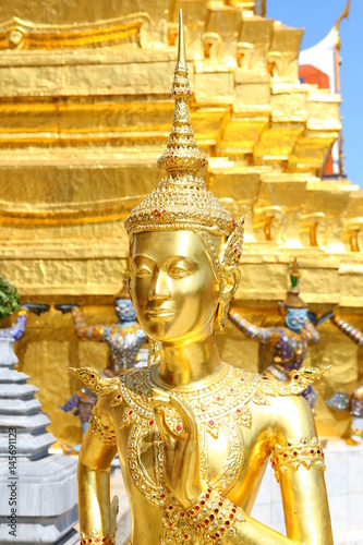 © zilvergolf, Fototapeta premium Golden Kinnaree holding flower against pagoda background on display at wat pra kaew in Bangkok, Thailand.