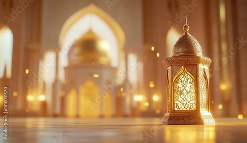© Udin, Fototapeta premium Golden lantern in a mosque. Soft, warm light illuminates the interior