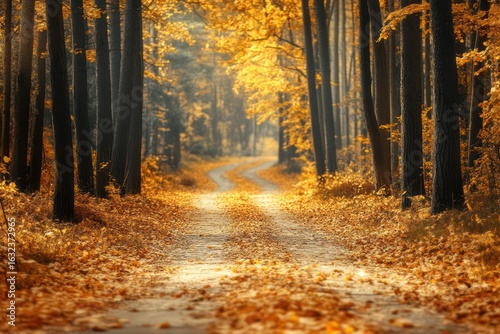 Fototapeta premium Golden leaf-covered path in autumn forest tunnel