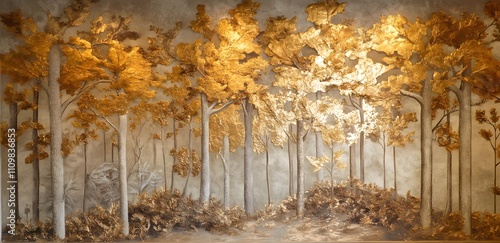 © paper later, Obraz premium Golden Leaves Adorn Tall Trees In A Serene Forest Scene