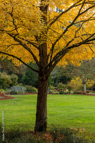 © lvonbiela, Fototapeta premium Golden leaves and green grass in Ebright Park