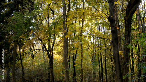 Fototapeta premium Golden leaves dance in a tranquil autumn forest near twilight