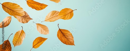 © Photography09, Obraz premium Golden leaves drifting in circles, caught in an autumn breeze