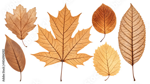 Fototapeta premium Golden Leaves in Autumn's Embrace: A close-up of stunning collection of autumn leaves in varied shapes and warm hues. Featuring a detailed exploration of each leaf's textures and structures.